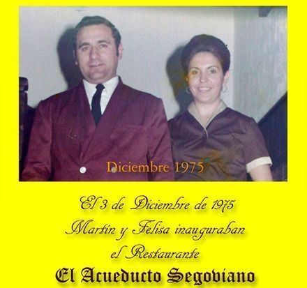 El Restaurante EL ACUEDUCTO SEGOVIANO fue inaugurado en noviembre de 1.975 por MARTÍN , Maestro Asador de Castilla, y FELISA, trasladándose de una pequeña Casa de Comidas que tenían unos metros más abajo en la misma calle a este nuevo local.